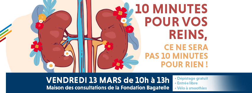 Dans le cadre de la semaine nationale du rein, la Fondation Bagatelle, en partenariat avec la Maison du rein AURAD Aquitaine, vous invite à une matinée dédiée à la santé des reins : venez vous informer, poser vos questions avec des professionnels de santé et bénéficier d’un dépistage simple et gratuit lors de notre matinée dédiée à la santé des reins.