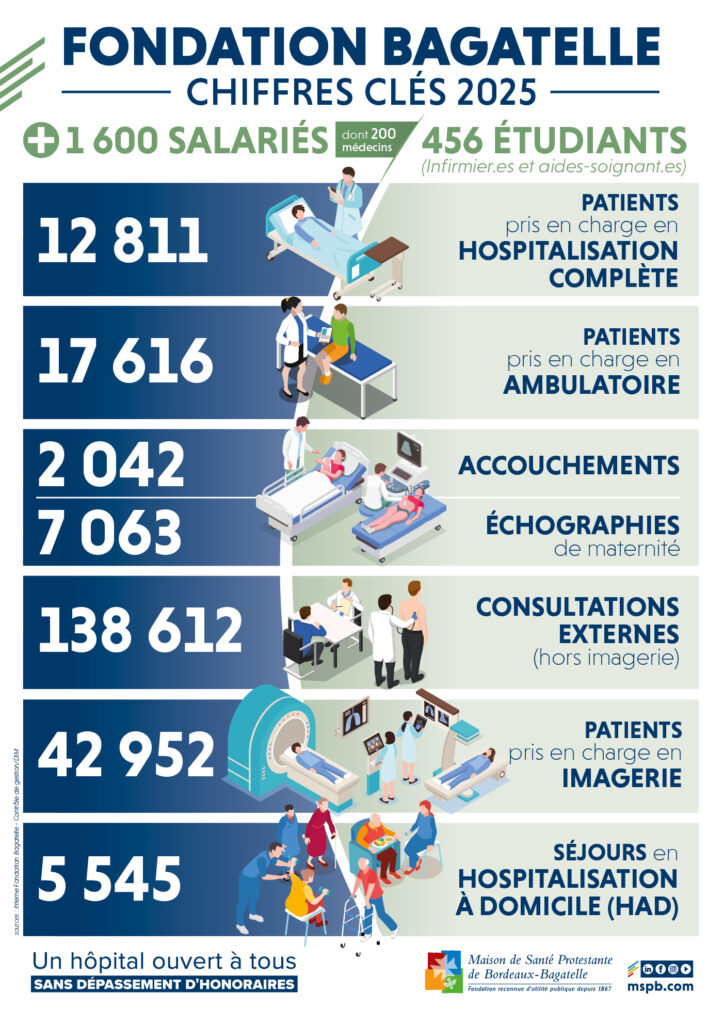 La Maison de Santé Protestante (MSP) voit le jour en 1863 pour “recevoir gratuitement les malades pauvres des deux sexes appartenant aux diverses églises protestantes de la localité ainsi que les marins étrangers des navires en rade”. Fondation reconnue d’utilité publique en 1867, elle s’installe après la première guerre mondiale sur le site actuel de Bagatelle, à Talence.