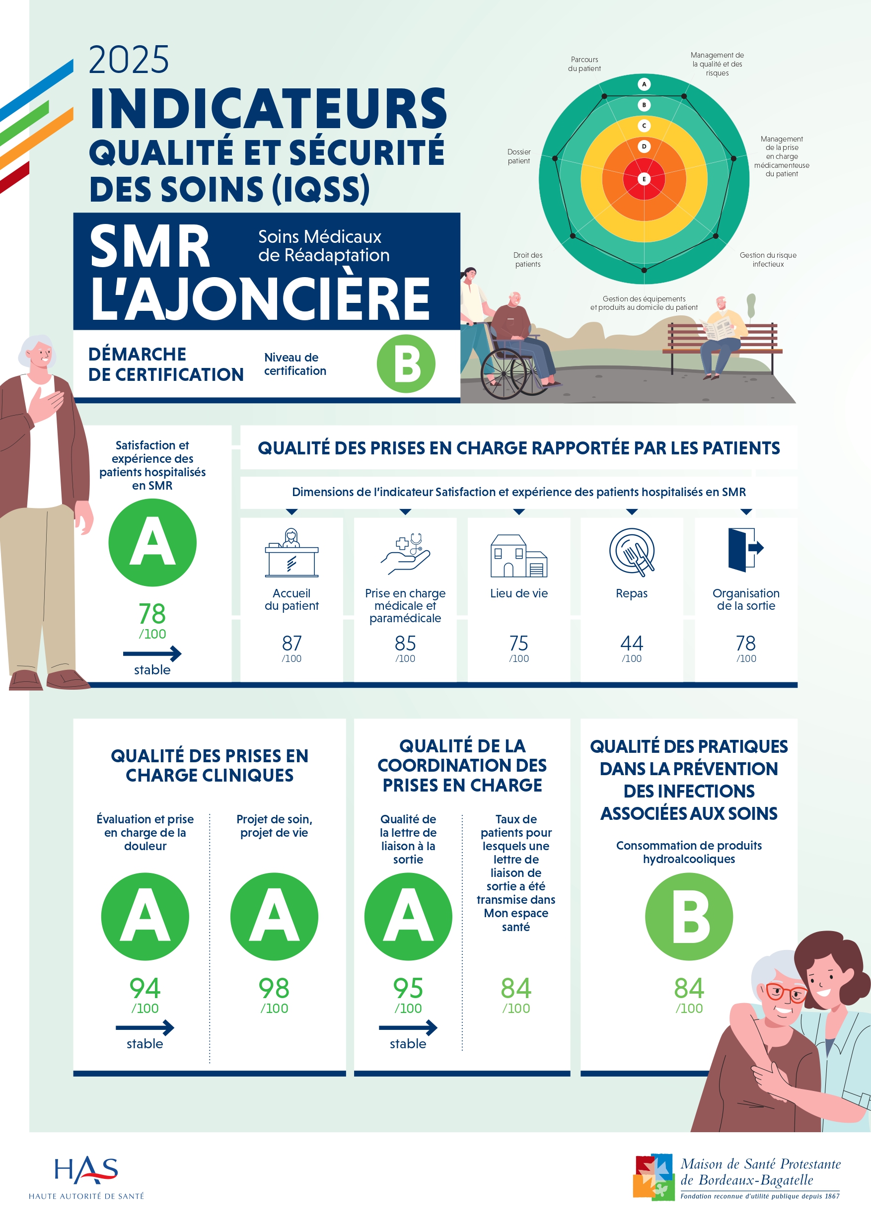 L’établissement recueille de nombreux indicateurs externes ou internes afin de déterminer le niveau de qualité. Retrouvez l’ensemble de nos indicateurs sur QualiScope.